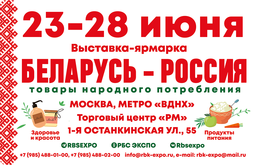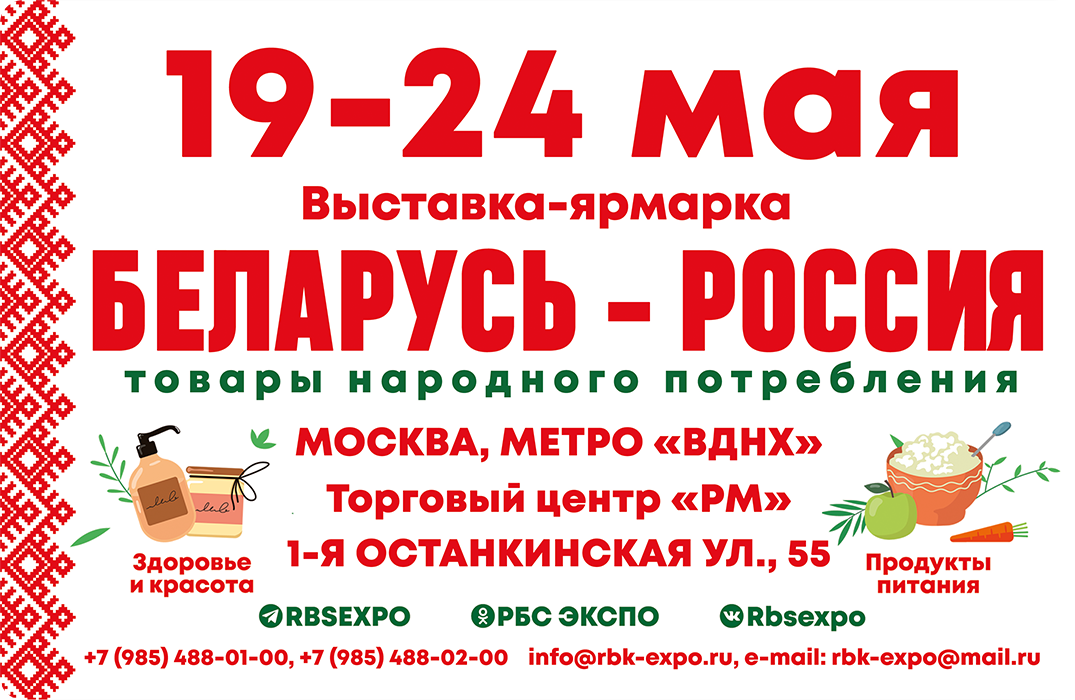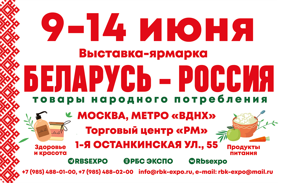 Дорогие гости! Приглашаем Вас посетить наше мероприятие "Беларусь-Россия" с 28 апреля по 3 мая 2026 года! Выставка-ярмарка будет проходить по адресу: Метро "ВДНХ", ТЦ "РМ", 1-ая Останкинская ул., 55, 2 этаж.